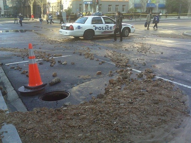 We’ve been getting a steady stream of emails from frustrated readers who arrived at their offices late this morning due to 16th Street NW being closed, at first below M Street, and now we’re told as far north as up to R Street. The mess is due to a water main break at 16th and L Streets (part of L is also closed) that’s also causing low water pressure for a couple of office buildings at the intersection. We’ll update when we have more, but in the meantime, we’re hearing it’d be best to avoid 16th, 17th and K and L Streets in the area.