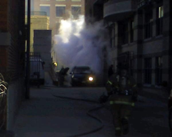Longtime reader and photo contributor Jaime Fearer sent us this cameraphone shot of a minivan that caught on fire in an alley next to 1401 17th Street NW, near O Street. Jamie reports that firefighters are on the scene trying to get inside the car and that the fire appears to be contained at this point, though the horn in the minivan was going off at just after 12:15 p.m. 17th Street is temporarily closed right now between Massachusetts Ave. and P Street NW while firefighters work. Parts of O Street may also be closed in the area, so plan accordingly.