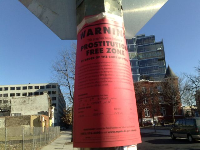 Truth be told, this isn’t the first time the MPD has declared a PFZ. You can read about how the law works here, but the basic idea is that it allows police officers to issue fines of $300 to a group of two or more persons found congregating in a public space or property within the PFZ for the purpose of engaging in prostitution or prostitution-related offenses. Still, these signs are sure to look mighty funny to most people walking through the area on their way to the Inauguration on Tuesday.