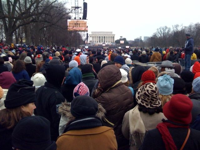 >> The lines at checkpoints were crazy, so much so that security shut them down shortly after 2:30 p.m. People began running toward the Washington Monument to grab any patch of land surrounding any of the 2 jumbotrons. -Tracy Clayton