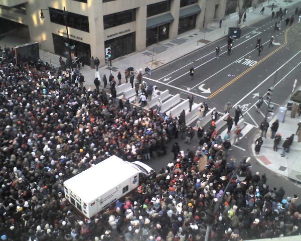 In related news, DCist’s Lynne Venart reports from the 12th Street parade entrance that after waiting for nearly an hour at the gate, she is giving up. “They are letting four people in at a time the crowd is at a standstill,” Venart said.