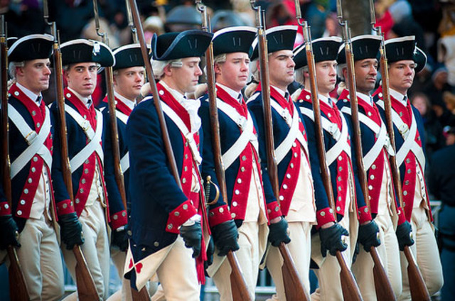 Update: 3:10 p.m.: The men in the photo above are not part of the Old Fife and Drum Corps; rather they are part of the Continental Color Guard, a specialty platoon of the 3d U.S. Infantry Regiment, a.k.a. “the Old Guard.” The Fife and Drum Corps are also part of that Regiment and have a very similar uniform – red jackets with blue trim, as opposed to the blue jackets with red trim pictured above. We apologize for the confusion.