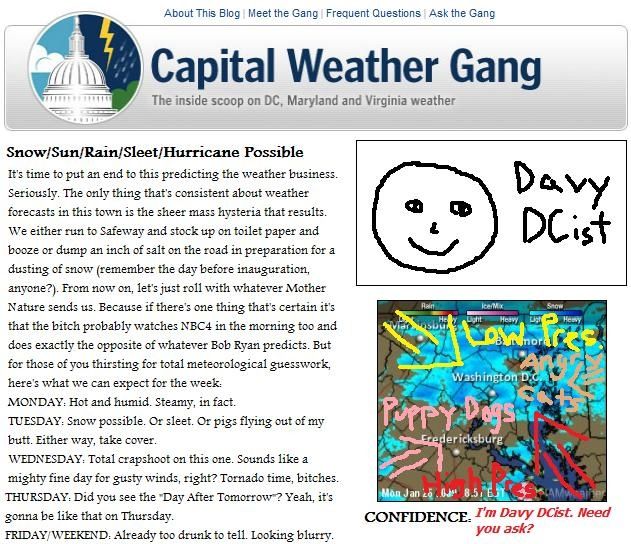 Stay tuned to our friends at Capital Weather Gang for updates, but take care to avoid forecasting imposters, like our own Davy DCist.