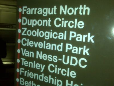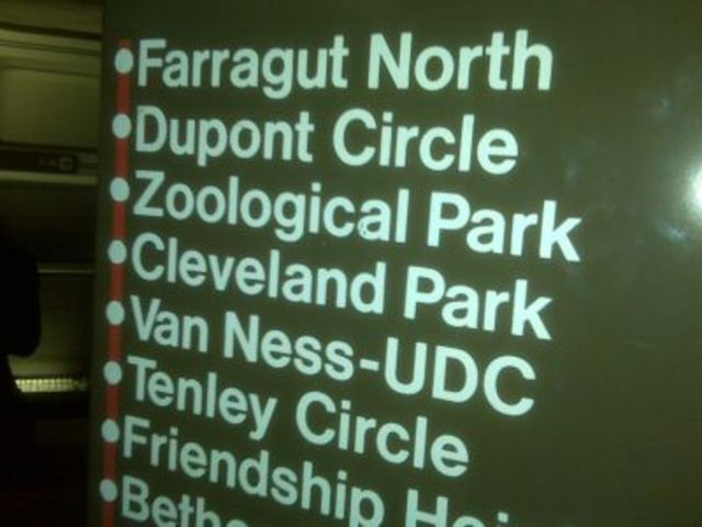 Reader Zach Sparer sent us this image from a station pylon inside Farragut North Metro. Something’s clearly not right here. Since when is the Woodley Park-Zoo/Adams Morgan Metro station called “Zoological Park”? And what about “Tenley Circle”?