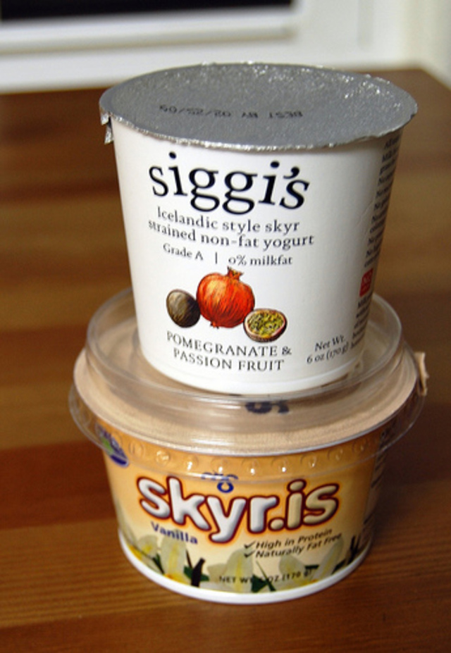 Both the Skyr.is and Siggi’s brands have a lot to offer. The skyr.is vanilla flavor has a great vanilla bean flavor and is wonderful with granola. Though the fruit flavors (strawberry and blueberry) leave a little something to be desired. Siggi’s pomegranate and passionfruit flavor is subtle, with the slightly sweet acidic fruits and a touch of low glycemic index agave nectar. Siggi’s also comes in orange ginger, blueberry, and plain. The plain flavors of both would do really well as a substitute for sour cream – still giving a heavy mouthfeel with maybe a touch more acidity. Or utilize its less watery properties and spread it on cake and top off with fruit.