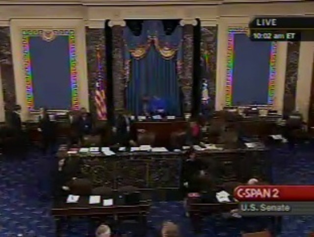 10:01 a.m. The Senate comes into session with its usual pledge of allegiance, etc. Now Majority Leader Sen. Harry Reid is explaining how the day’s work will go in the Senate, including taking up S.160. He’s actually proposing voting on the actual bill today, sometime around 5 p.m. That’s big news.