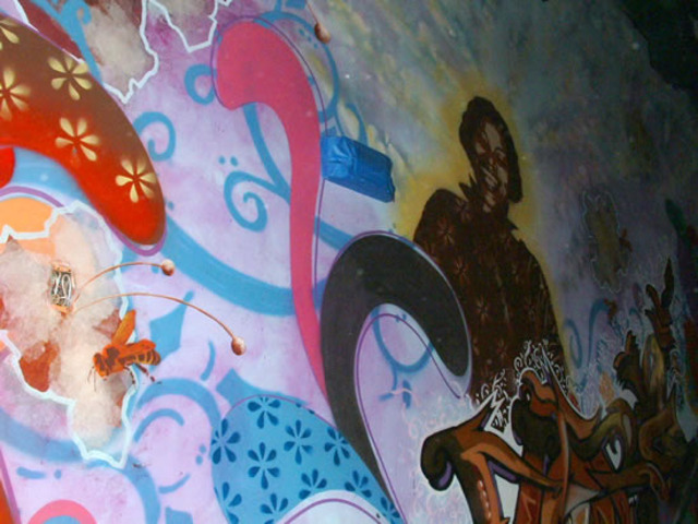 About 20 visual artists are participating in the event, and began painting their floor-to-ceiling murals on Thursday afternoon. The work varies in style and execution: some pieces channel graffiti and others lean more toward abstraction and realism. Saturday’s opening reception will feature a variety of DJs and bands, including Noon:30, DJ Natty Boom, Cara Fleck, Too Deep, and Jessica Chambliss. Artists include organizer Chanel Compton, as well as familiar faces Decoy and Kelly Towles, among others.