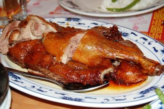 One of my favorite dishes is roast duck. Delicious meat and crisp skin. What’s not to love? Except, of course, for the extreme difficulty in doing it well. So many Chinese restaurants tend to give you weak ducks with a small amount of flavorless meat, a quarter inch layer of fat, and a lackluster skin. They may also crisp the skin up by pouring hot oil over the top to “fry” the skin. This ends up being quite problematic, as many restaurants appear to reuse the oil over and over again, leading to an off flavor. Those ducks should be relegated to the Peking duck preparation of pancakes, plum sauce, and scallions, which masks the flavors of subpar duck. Good roast duck plays best with a neutral background of white rice.