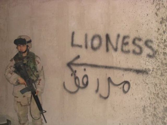 Sergeant Michelle Brookfield Wilmot on guard duty in Ramadi, Iraq from the documentary Lioness. Photograph by Spc. Miranda Mattingly.The Iraq war has seen the introduction of an important, if unintentional, change in the way the military wages war. While women are still technically forbidden from ground combat positions, the reality of a different kind of warfare in Iraq is that soldiers in “support” positions are now frequently called upon to fight shoulder to shoulder with the front line infantry. Many of these soldiers are women, who often arrive unprepared for this combat, not through any inherent deficiency, but rather because of the military’s unwillingness to train them for a job they technically aren’t allowed to do. Filmmakers Meg McLagen and Daria Sommers profile five such soldiers, the “lionesses” of the Iraq war, to examine the role women play in the modern American military, and their impact not only on the war itself, but the impact of that role on their own lives. These are women who, because they cannot be officially recognized as combatants, often put their lives at risk with no recognition of their achievements; this isn’t just an insult, but has serious career ramifications for soldiers who are restricted from moving up the chain because their contributions are consistently ignored and undervalued.