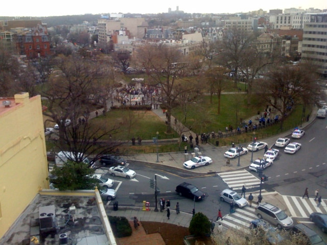 A group of protesters have gathered in the Dupont Circle neighborhood, blocking traffic along some corridors. DCist’s Fredo Alvarez captured these two images, one of the protesters (we’re told they are an anti-war group, carrying signs with messages varying from identifying themselves with Students for a Democratic Society to “Make Funk, Not War”), and the other of an MPD vehicle that’s been splattered with red paint. We don’t have many reliable details at this point, but we’ve heard that for at least part of their march, the group went the wrong way down 19th Street NW, causing a lot of traffic backup, and that they were also spotted near M Street NW between 16th and 17th, creating a traffic jam there as well. Several reports indicate the police response appears to be disproportional to the small number of protesters (maybe the going down the wrong way on a one-way street had something to do with that?). We’ll update with more soon.
