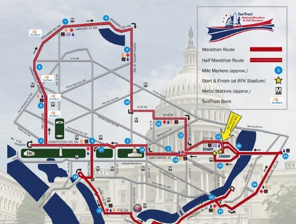 Details on Metrorail and Metrobus schedule changes can be found here. The bottom line: a whole lot buses are being rerouted to go around the race course. Pretty much every bus that travels through the center of the city will be affected: the 5A, 13A, 13B, 13F, 13G, 32, 34, 36, 38B, 42, 52, 54, 64, 70, 80, 90, 92, 96, 98, A42, A46, A48, B2, D4, D6, D8, G8, H2, H4, H8, L2, M6, N6, N22, P6, S2, S4, U6, V8, X2 and X8. Whew! Look up your specific route’s detours here. To help deal with the mess, Metro is opening at 5 a.m. tomorrow to accommodate runners trying to reach the race by its 7 a.m. start time (FYI, the starting line is near the Stadium-Armory station, so keep that in mind as you plan your mornings).