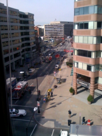 A suspicious package report at just a little after 10 a.m. this morning shut down I Street NW between 19th Street and Pennsylvania Ave, as well as parts of the surrounding area. The package was reported found in the rear of 2001 Pennsylvania Ave. NW, a large office building that from the street appears to be located on I Street, despite its street address. DCist reader Ryan sent in this view of the scene from his office window.