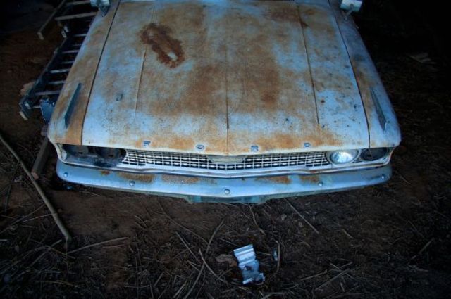 Yonas1 found this lonely, aging car, with its terrific faded blue and rusty orange colors, out on a trip to Rappahannock, Va. this weekend. I am, admittedly, not a car person, so first person who can name the model and year of this Ford wins a firm pat on the back. EXIF.