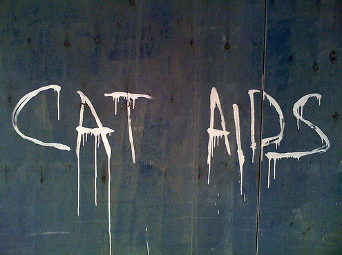 That there is some choice graffiti, documented by kobito. So, what the hell does that mean? Is it an honest-to-goodness public service announcement or a sort of vaguely sarcastic effort to reclaim the word AIDS from its tragic connotations? You see groups like AIDS Wolf and Black Nasty doing this reclamation work, citing AIDS in experimental and even comic gestures. And I’m sure there are more out there lurking in places like Portland, Oregon. Of course, maybe I just have it wrong, and Cat AIDS is a severe problem in Dupont Circle.