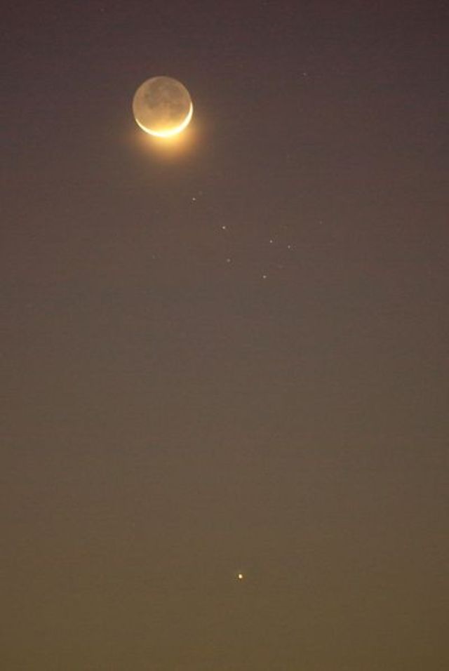 DCist’s resident astrophotographer, philliefan99, is up to the task during the planet-filled sky we’ll have for the next month. Though a little hazy through the city-lights and setting sun (you may need to dust your monitor off), he captured here the crescent moon, under which sits the Pleiades, or Seven Sisters, a star cluster located in the constellation Taurus. In Greek mythology, the Pleiades are the seven daughters of Atlas, and the nine brightest stars are named after the sisters and their parents. Over 1,000 stars actually sit in the cluster, and the entire thing is currently passing through a dusty nebula, making it a great observational teaching tool (it looks much cooler the more you can see, even with just a set of binoculars).