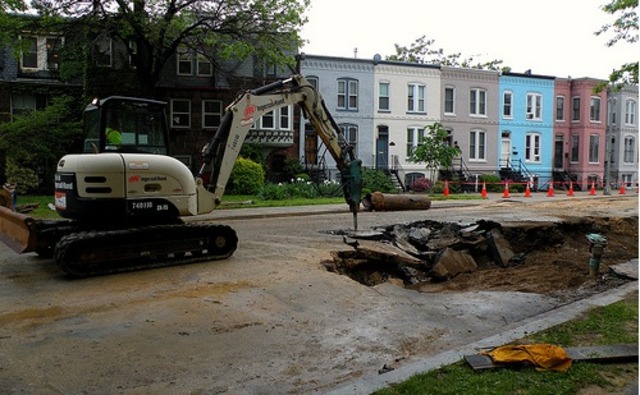 The word on high from DDOT after Wednesday’s massive water main break in the 1700 block of Florida Ave. is that the street won’t reopen until Saturday evening, weather permitting. DDOT engineers spent today assessing the damage and came up with this time estimate. Work crews have already backfilled the large hole in the roadway, and are now preparing for the complete reconstruction of the road surface from V Street to Champlain Street. The work will also include the repair or replacement of damaged curbs and brick gutters, and sidewalk repairs as necessary.