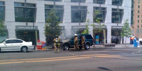 We got several tips about a car catching fire on 17th Street NW near K, right by Farragut Square a little while ago. Reader Brett Andriesen was kind enough to send in this image from his phone – looks like the fire department already has the situation under control. Hope that wasn’t your green SUV (looks like an Explorer maybe?).
