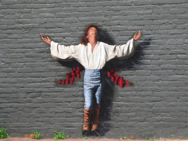 Gah! My first thought in coming across this photo in the Flickr stream was most definitely, “What in the name of all that’s holy IS THIS? And why would Kyle Walton put this in the DCist Flickr pool where anyone could innocently stumble over it?” I was going to quickly click onto the next image, but curiosity overwhelmed me and I Googled the tag “William M. Cochran,” which led to the bizarro-geocities-esque page for The Community Bridge. Apparently, Cochran is a “professional public artist and trompe l’oeil master” in Frederick, Md., most famous for his $500,000 illusion painted onto a pretty damn ugly bridge. He says that the fake gates are so real-looking that birds try to land on them, which is hilarious and… kind of mean? He paints other various illusions around town, including the terrifying Jesus, David Copperfield, Mel Gibson The Edge of Gravity you see above. Enjoy!