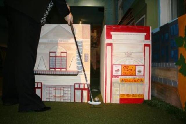 What ended up as a 9-hole course upstairs is heavy on artistic flare and inside the beltway humor. Instead of dodging rotating windmill blades, you’ll time your swing around a K Street Lego Lawyer swinging his briefcase on Hole 3. You’ll find on Hole 6 the de rigueur loop-de-loop fashioned as the Springfield Mixing Bowl, complete with a ramp to nowhere and wrecked autos to hold up [golf ball] traffic. Tap the ball through the legs of an obese meter maid with his pants falling down, around a zombie like FDR, or between the Lincoln Theater and Ben’s Chili Bowl.