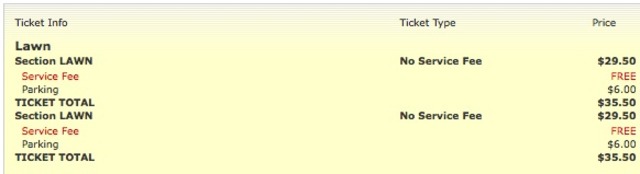As you can see, the “service fees” were indeed waived, but the mandatory $6 “parking” fees associated with Nissan Pavilion are still in effect. Fees associated with printing your tickets at home are also waived farther down the checkout window, and the final purchasing stage didn’t produce any “facility” fees at Nissan – though that’s the only venue we’ve checked out so far.