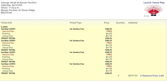 As an addendum to our earlier post looking at how today’s Live Nation “no service fee” promotion actually played out, check out the screencap below, provided by DCist reader Damon. As you can see, tickets to the June 13 George Strait concert also include a $4.75 per ticket “venue fee” in addition to a parking fee. We were not charged the “venue fee” for tickets to the July 28 Depeche Mode concert (though our parking fee was higher, at $6 per ticket), but it does appear some Nissan Pavilion concerts in this promotion do carry such a fee.
