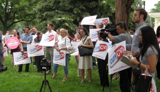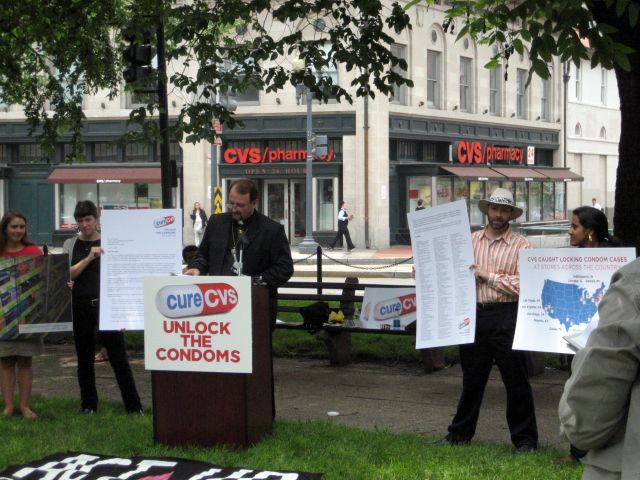 That was among the many messages a group of protesters discussed in Dupont Circle this afternoon. About 50 people representing a coalition of organizations and activists that includes the National Organization of Women, the Latino Commission on AIDS, Black Women for Wellness, the Community HIV/AIDS Mobilization Project and many others gathered today to announce a nationwide campaign against CVS for the practice of locking up condoms in their stores. The Cure CVS: Unlock the Condoms Initiative is asking CVS to adopt a corporate policy to keep all condoms unlocked at all times.