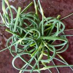When picking through the sea of papery, white garlic bulbs in the supermarket grocery store, it’s easy to forget that garlic was once a fresh, green plant growing in the earth. I’m reminded every so often, when I let a bulb of garlic go too long in my kitchen, only to later find it growing a little green shoot sprouting out of the top. As it turns out, the garlic stem or scape is also edible, with a milder flavor than the bulb. When the garlic is still in the ground, the scapes grow into fanciful curves and curls, but as the garlic matures, the stems straighten and become too tough to eat.