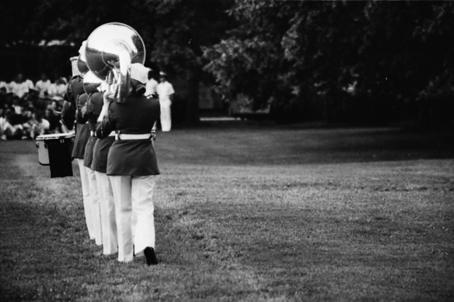 Turns out, they do this every Tuesday from Memorial Day through August. Since I just moved here last August, I missed it before. The band plays and they go through the silent drill, which is damn cool. I could never catch the baton like that! They start practicing around 5:45 p.m.