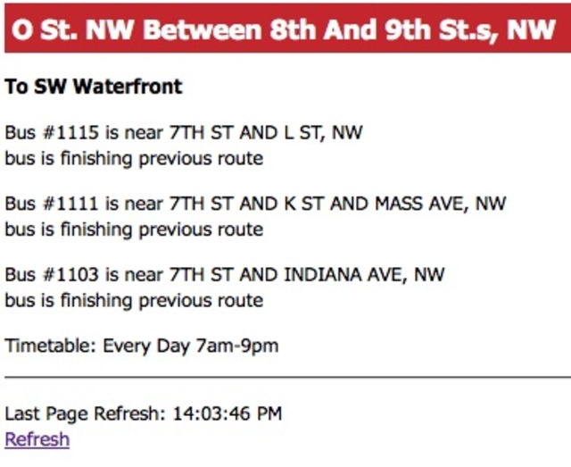 Of course, given that the concept behind the Circulator is that it’s supposed to run every 10 minutes and take away the guess work of how long you’ll have to wait, this application is much less crucial for most riders than the forthcoming NextBus service for Metrobus. Still, more information is always better, and we’ll surely try out using the service. The site itself is pretty simple, though it does require a minimum of three clicks to get the information you’re looking for. It also doesn’t give you any approximate times based on the distances between your stop and the bus location — it merely tells you what intersection the bus is at, and leaves you to decide how long it will take to get from there to where you are.