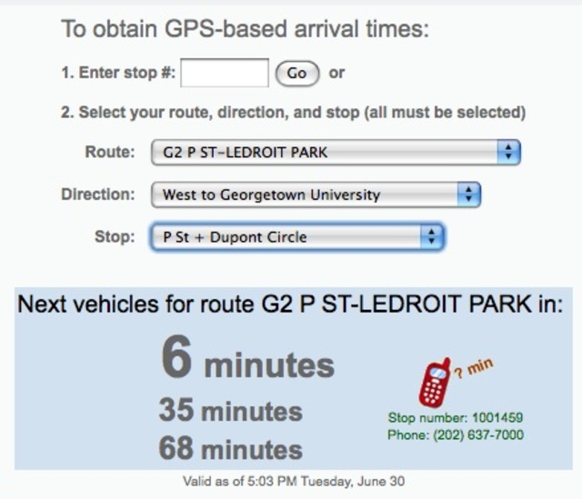 Internet: From any web enabled mobile device (or from your home computer), go to http://wmata.nextbus.com and enter your bus stop number. You can also choose the route number, direction and stop location instead, by using the drop down menus. (Metro keeps insisting in their Next Bus press materials that you start at MetroOpensDoors.com to find the Next Bus link, but it’s not on their homepage yet, and we’d rather send you straight to the tool anyway). Next Bus will then give the estimated arrival time of the next three buses at your stop.