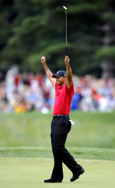 Tiger Woods celebrates after winning the AT&T National golf tournamentat Congressional Country Club, Sunday, July 5, 2009, in Bethesda, Md.