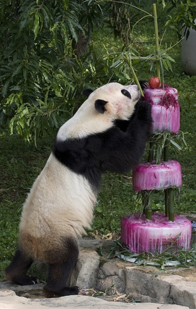 Photo by Mehgan Murphy/Smithsonian’s National ZooThe National Zoo once again rolled out the fanfare for superstar giant panda Tai Shan this morning, as D.C.’s favorite ball of fur (and stick of butter) turned 4. Now a teenager in “bear years,” the panda dug into a three-tiered, frozen “cake” made out of water, beet juice, bamboo and fruit that was prepared by Zoo staff. Crowds of onlookers were on hand early this morning to watch the panda dig in to his treat and wish him a happy birthday.