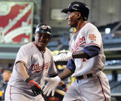 Nyjer Morgan (right) is congratulated by Ronnie Belliard after scoring the winningrun to finish a game that had been previously suspended. (AP Photo/Pat Sullivan).