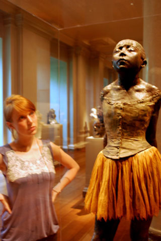 The clerk, Randy (Kevin O’Reilly) has a thing for one of his brittle customers, Beth (Meghan Nesmith), while National Gallery security guard Nigel (Matt Pearson) is besotted with a sculpture (!) that appears to be Edgar Degas’s Little Dancer Aged Fourteen. Gwen Grastorf plays the statue, and she brings a disciplined physicality to the part, interrupting long stretches of stillness with fluid, graceful movements. She also does some great work just with her eyes. “Without your mouth language, we statues vibrate from the inside out,” she tells an understandably vexed Nigel.