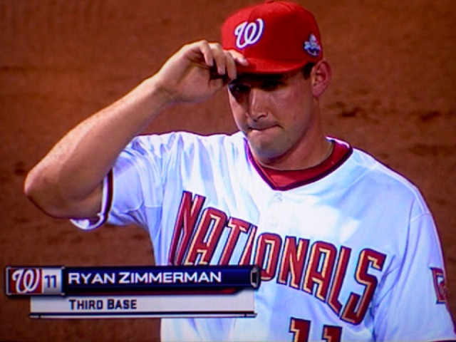 - American League 4, National League 3: Hey, it’s a Nat at the All-Star Game! (Not that it was anything to write home about.) Washington representative Ryan Zimmerman — seen above coolly acknowledging all twelve people at Busch Stadium who realized that Washington actually fielded a major league-level baseball team — entered the game in the top of the the fifth inning, replacing David Wright at third base. Zimmerman almost got into one in the bottom of the fifth, but just got under the second pitch he saw, flying out harmlessly to A.L. center fielder Josh Hamilton. Obviously unsatisfied with the length of his first trip to the plate, Zimmerman swung at the first pitch he saw in his second at-bat, weakly popping out to right. As far as I could tell from the television coverage, Zimmerman had nary a truly meaningful ball thrown or hit to him in the field — although at one point, I think I caught an unfocused glimpse of Zimmerman in the background as Derek Jeter ran past him at third. So, you know, there’s that.