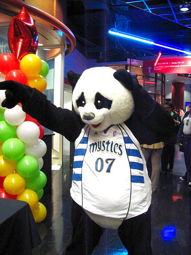 - Silver Stars 79, Mystics 78: Well, so much for that undefeated homestand. The Mystics lost another heartbreaker last night, even though they outscored the Stars in both the third and fourth quarters. The Mystics downfall? The dynamic duo of Becky Hammon and Sophia Young, who scored 41 of San Antonio’s 79 points. (More than half the team’s total points? Not too shabby.) The Mystics had a chance to win on the game’s final possession, but Lindsay Harding’s inbounds pass was stolen. Harding scored 18 points and Alana Beard had 17 to lead the Mystics, who are now 2-5 in their last seven after starting the season with a 4-1 record. But they’ve still got an fuzzy panda mascot (see right), so that’s got to count for something.