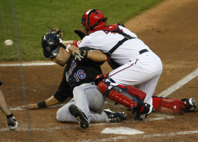 Nationals catcher Josh Bard laid down a hefty tag on the Mets’ Angel Pagan in the second inning, but forgot the most important thing — the ball. (AP Photo/Gerald Herbert)- Mets 6, Nationals 2: Contributing seven solid innings, veteran hurler Livan Hernandez (6-5) pushed his impressive career record against Washington to eight wins in nine decisions with the Mets’ 6-2 victory at Nationals Park last night. New York jumped all over debutant J.D. Martin (0-1), who could only last four innings in his first career major league effort. On the other hand, Hernandez was impressive all night, allowing only five hits — although he was given plenty of help from the Metropolitans’ first two innings at the dish: two doubles in the first and a string of singles in the second staked the Cuban to an early 5-0 lead. As usual, the home team found themselves in a hole too deep to navigate — a hole which they’ve fallen into numerous times since interim manager Jim Riggleman took the reins one week ago. One bright spot? Pitcher Tyler Clippard, whose three shutout innings of mop-up work — including no hits and five strikeouts — could earn him another look as a starter sometime soon.