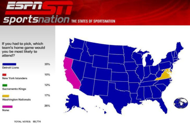 ESPN — bastion of unbiased, scientific polling that it is — offered this incredibly positive query last night to Sportscenter viewers: “If you had to pick, which home team’s game would you be most likely to attend?” Of course, what they meant to say was, “Look, let’s say you end up in Hell, and your infinite punishment is that you’re forced to attend home games for one the worst professional franchises in each of the four major sports for all eternity: which one do you pick?” A majority of the country opted to go with the lowly Detroit Lions, because, you know, WOO FOOTBALL and all — but look at us, D.C., Maryland, and Virginia! We’re keeping it real with the Nats, the only team aside from the Lions to win a geographical area. (California, being far too cool to be associated with any of these loser squads, opted to go with the “None” option. Man, Kings fans in the state capital must be feeling great right about now.)