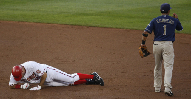 Why was Nick Johnson trying to steal second? Who knows — but his reaction after being thrown out, shown here, should feel familiar to anyone who’s spent any sizable time watching the Nats this year. (AP Photo/Pablo Martinez Monsivais)