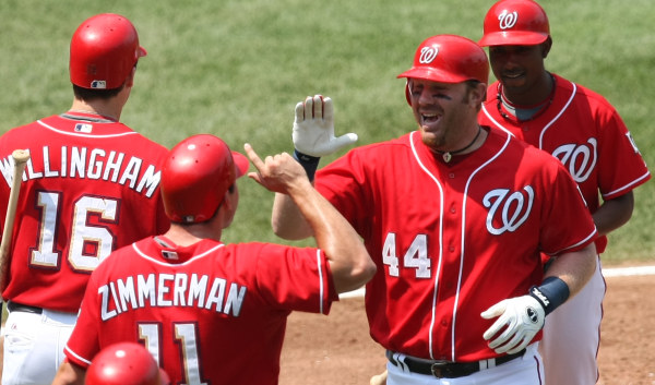 Adam Dunn (44) celebrates after hitting a two-run home run yesterday, helping the Nats to their eighth straight. Happy days, people. (AP Photo/Luis M. Alvarez)