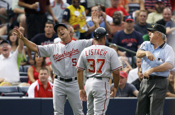 Now playing: a live-action version of “Alexander and the Terrible, Horrible, No Good, Very Bad Day,” with Jim Riggleman in the title role. (AP Photo/John Bazemore)- Braves 8, Nationals 1: You think you had a bad day? Nationals manager Jim Riggleman certainly can relate. First, he was informed that one of his two great young pitchers — Jordan Zimmermann — will be sidelined for the next 18 months after he undergoes Tommy John surgery. Then, his other great young pitcher — John Lannan — took the mound in Atlanta and tossed one of his worst games of the season. Lannan (8-9) allowed six runs and four walks in 4.2 innings, and Nats hitters struck out 13 times, which was plenty to put an end to Washington’s eight-game winning streak. Braves rookie starter Tommy Hanson (7-2) was on all night, allowing seven hits in nearly as many innings. To top it off, Nationals hitting coach Rick Eckstein was ejected in the third inning after arguing a tough call on a steal attempt by Nyjer Morgan at third base. Eckstein then had to be restrained by Riggleman after getting tossed, something I’m sure that the manager was oh-so-pleased about having to do. Hey, when it rains, it pours. But keep an eye out for that rainbow, skipper — after all, you’ve led the worst team in the bigs to a respectable 14-12 record since you took over, so it’s not all bad.