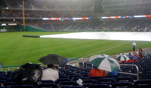 Hopefully you brought your umbrella to Nationals Park last night — these lucky folks didn’t have to run for cover.Brewers 7, Nationals 3: The Nats couldn’t really get the offense going, and dropped their fourth straight decision. Adam Dunn did smash his 32nd home run of the season, and Ryan Zimmerman added a solo blast in the ninth. But it wasn’t enough to overcome some very poor hitting by the bottom of the order — five hits in total just isn’t going to cut it. It’s a concerning trend for the Nationals, especially as they can I’ll afford to waste solid pitching performances like the one J.D. Martin delivered. Martin (2-3), though far from fantastic, was generally under control: four runs in 6.2 innings, which could have been even better if the Nats had a couple of close calls go their way. Normally, this kind of pitching performance would put Washington in a good position to win. However, Braden Looper (11-6) was dynamic aside from the Dunn homer, and Jorge Sosa looked plain awful in a seemingly interminable top of the ninth, allowing three runs. The weather certainly didn’t help matters much — rain fell over the game for most of the evening. (But it was nice and sunny for the introduction of one young Mr. Strasburg. Coincidence? We think not.)