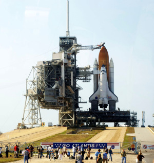 Image of Atlantis the day before lift-off earlier this year; Tuesday’s launch will be of Space Shuttle Discovery. Photo by Heather Goss.It’s a regular week of summer nights coming up. No meteor showers or amazing celestial events mark the calendar, but with the waxing Moon and (hopefully) some clear nights, it should be a great time to put on some bug spray and check out the regulars — start with the Summer Triangle we pointed out last week.