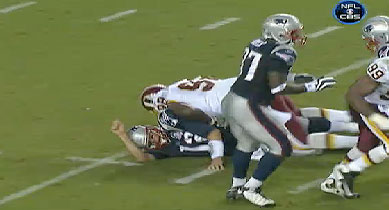 New Redskins defensive tackle Albert Haynesworth, obviously, thinks otherwise. The gigantic mountain of a man laid a lick on Tom Brady (video here) during last night’s exhibition loss against New England, squishing his shoulder between his 350 pound frame and the FedEx Field turf. Brady — who missed all of last season with a busted knee — got up gingerly and didn’t play another down last night, which seems about right after an enormous man runs your body into the ground. Brady was diagnosed with a sore shoulder.