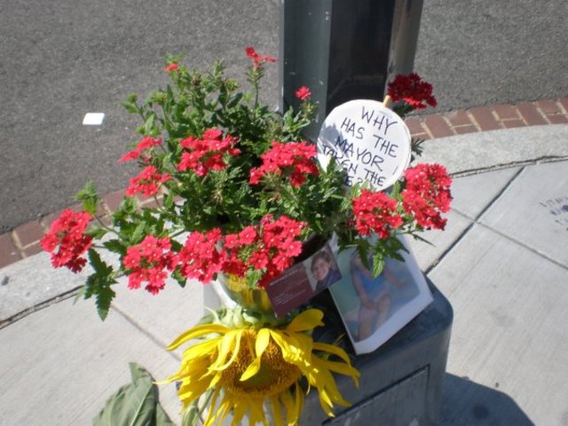 Perhaps it’s too much for us to expect the city to care, but removing a non-obstructive memorial remembering the death of a young person without notifying their family and friends — and then placing the ghost bike down the street — seems especially callous. Mayor Fenty and his administration might be building all sorts of shiny, expensive new facilities for the District, but he’d do well to keep the simple, meaningful things, like Swanson’s remembrance, in tact. In its place is a small bouquet of flowers, which Swanson’s aunt placed at the site yesterday.
