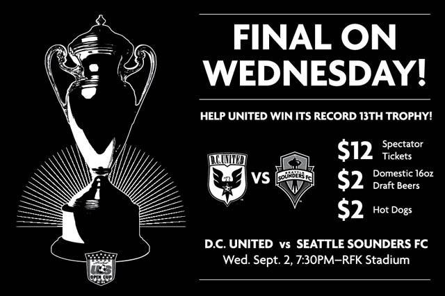 Join D.C. United this Wednesday, September 2, as the team attempts to win its record 13th trophy in the U.S. Open Cup final. Seattle Sounders FC will make its first ever visit to RFK Stadium for the championship match, set for 7:30 p.m. ET