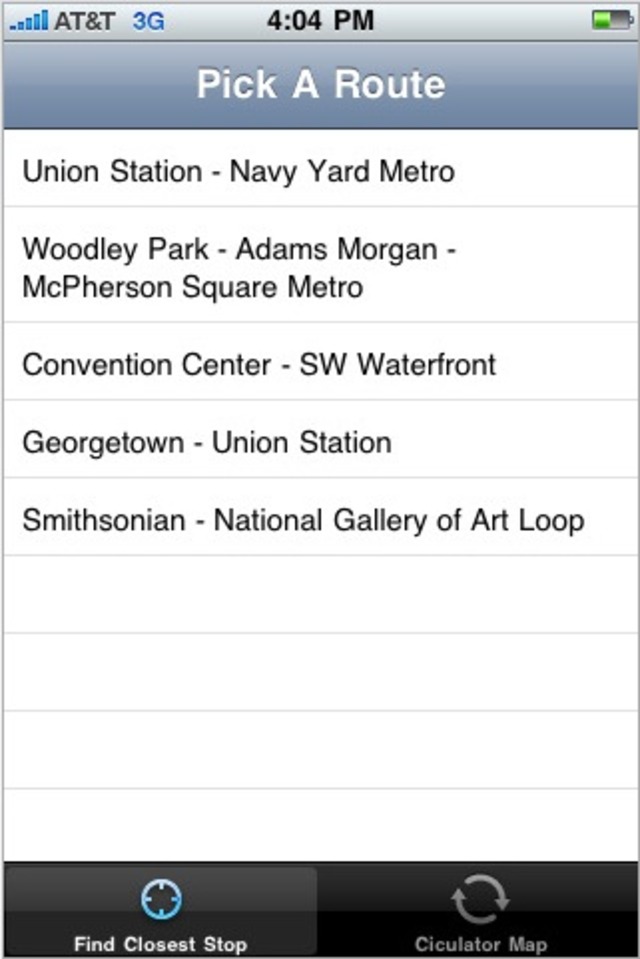 Somewhat similar to how the NextBus iPhone App works, the DC Circulator application allows users to figure out the closest Circulator bus stop location to where they are physically, based on GPS capability. The application requires that you select your chosen Circulator route before it will show you the closest stop, however, and the route map provided within the app is not at all interactive — it’s more or less just a static, .PDF style map that comes as a companion to the Where’s My Bus? data.