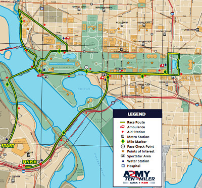 Each street that is part of the race course (the green and yellow lines to your right — click here for a larger PDF version; a text list of streets is after the jump) will close intermittently between 8 and 11 a.m, also causing rolling delays on neighboring streets. Want to avoid the mess by taking Metro? Do heed: track maintenance will cause some delays on the Red and Orange Lines tomorrow, so plan for 20-30 minutes of additional travel time. Also, all Metrobuses which originate and terminate at the Pentagon will be rerouted to Pentagon City until 2 p.m.. Metro will be opening at 6 a.m. tomorrow morning; but if that’s useful to anyone not running in the race, you have our sympathies for having to be up so early on a Sunday.