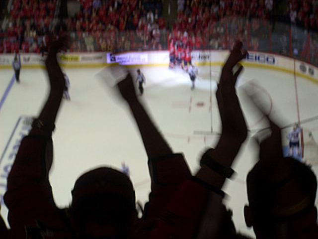 Since the lockout, Caps hockey has been mostly prosaic. Individual plays were cheered (or jeered) based on their individual merits. A couple hundred fans sometimes agreed that a play was worthy of praise, and so they got together with their hundred most polite indoor voices and said “yay.”
