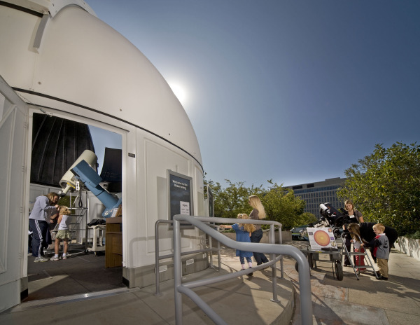 Back in early August, we previewed the Public Observatory Project at the National Air and Space Museum; this week the ribbon was cut and the telescope is officially in business. (Before I get too far, I should disclaim that I’m now a volunteer at POP — having worked in observatories during college, this was too good an opportunity to pass up — so I’m obviously a big fan of the project, and you may attempt to complete your DCist editor bingo card by trying to find me there during my weekly shift.) The observatory is focused on daytime observing and will be open Tuesday through Sunday, 10 a.m. to 2 p.m. The research-grade 16″ Boller and Chivens telescope, on loan from Harvard University, is fitted with a solar filter, making it perfect for viewing the Sun and Venus. On especially nice days, a portable 11″ Celestron scope is rolled out, to which are attached two smaller scopes fitted with H-alpha and CaK filters, allowing viewers to see different wavelengths of light coming from the Sun — during my first training session we caught spectacular prominence through the CaK scope. Programs with D.C. Public Schools will begin in November. The museum also has a new program in the Einstein Planetarium, Journey to the Stars.